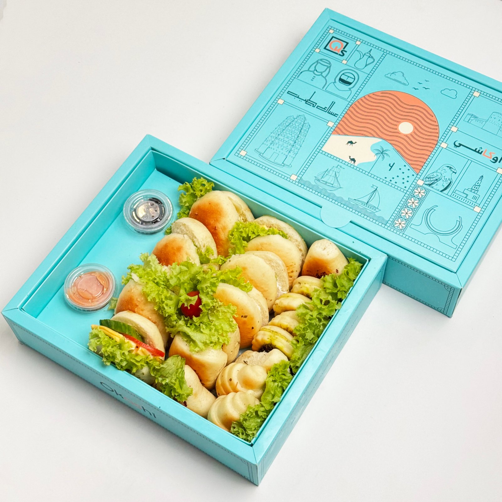 Inside the elegant turquoise box awaits an assortment of mini sandwiches made with the softest, freshest bread. Each bite-sized treat is lovingly crafted using crisp, flavorful veggie fillings, ensuring a delightful taste in every bite. Packed with an array of hand-selected vegetables and seasonings, these sandwiches offer a harmonious blend of textures and flavors to satisfy diverse palates. The freshness of the ingredients is evident in every crispy crunch and soft, fragrant bite.
